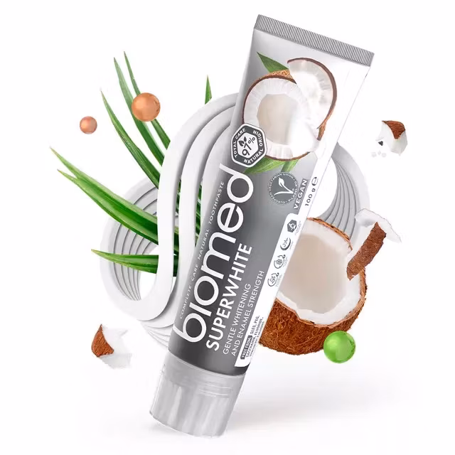 Biomed Superwhite är en tandkräm utvecklad för att varsamt men effektivt ljusa upp tändernas naturliga nyans. Med kokosnötextrakt, papayaenzymer och mineraler rengörs tänderna skonsamt samtidigt som fläckar från kaffe, te och rödvin reduceras. Tandkrämen innehåller 99 % naturliga ingredienser och är fri från fluor, SLS och syntetiska färgämnen.
