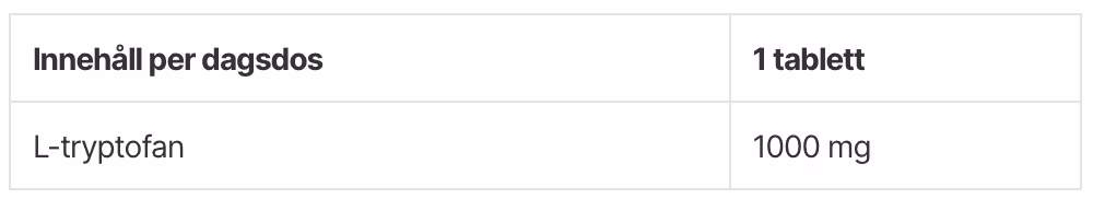 L-Tryptofan, mikrokristallin cellulosa, vitamin B6 (pyridoxin HCl), magnesiumoxid, vegetabilisk beläggning, klumpförebyggande medel (kiseldioxid, magnesiumsalter av fettsyror), stearinsyra.