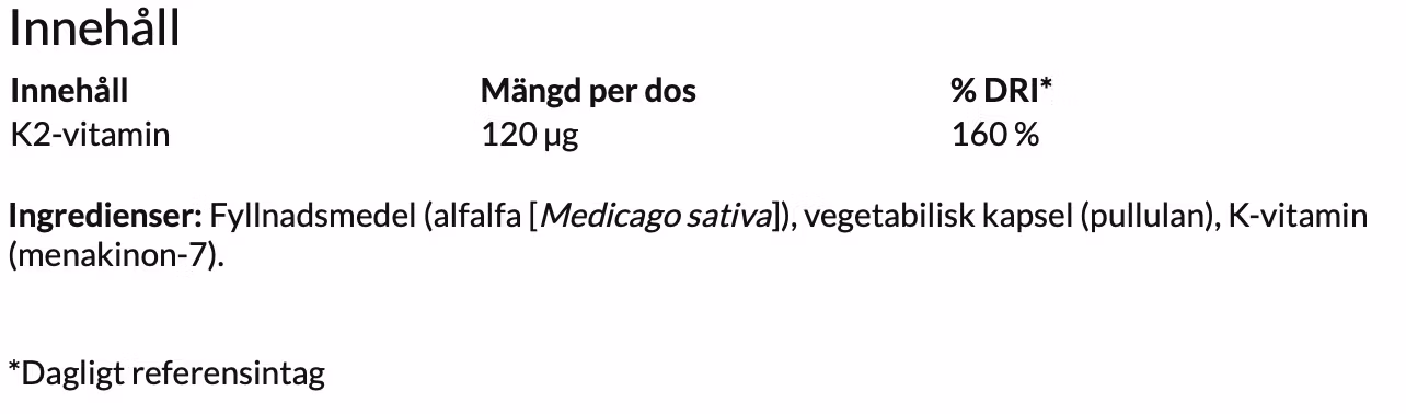 *Proteinbasen är organiskt menadinon‑7 utan tillsatt fyllnad. Exakta µg-specifikation saknas på sidan.