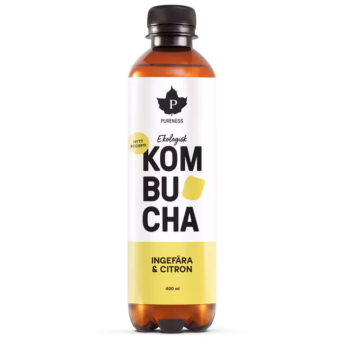| Ingefära & Citron (Ginger & Lemon) | Frisk citrus möter värmande ingefära – uppfriskande och kryddig balans. | Mineralvatten, ekologiskt rörsocker, ekologisk kombuchakultur, koldioxid, ekologiskt grönt te, naturliga aromer (ingefära, citron, lime). |