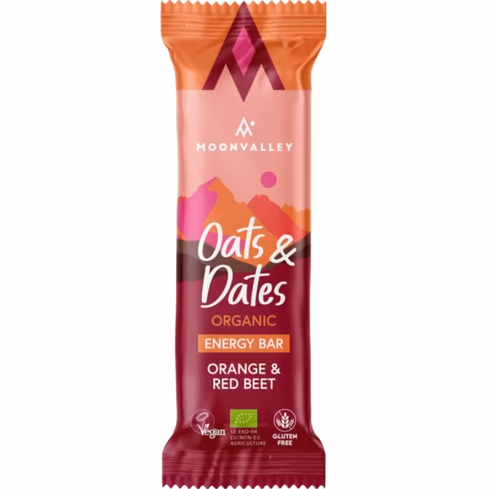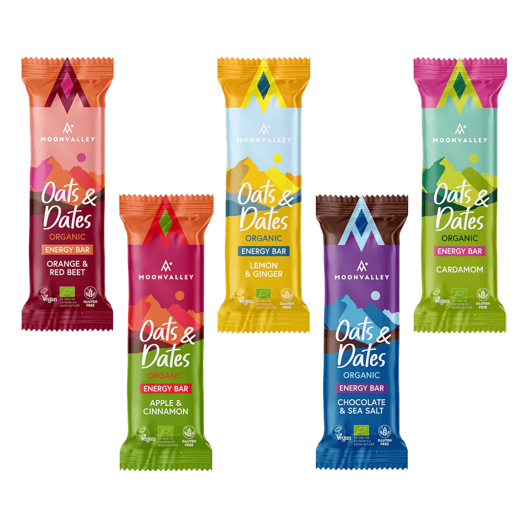 Moonvalley Oats & Dates Bars är ekologiska, veganska och glutenfria energibars baserade på havre och dadlar. De är framtagna för dig som vill ha ett naturligt mellanmål utan tillsatt socker, med en balanserad kombination av kolhydrater, fibrer och växtbaserat protein.